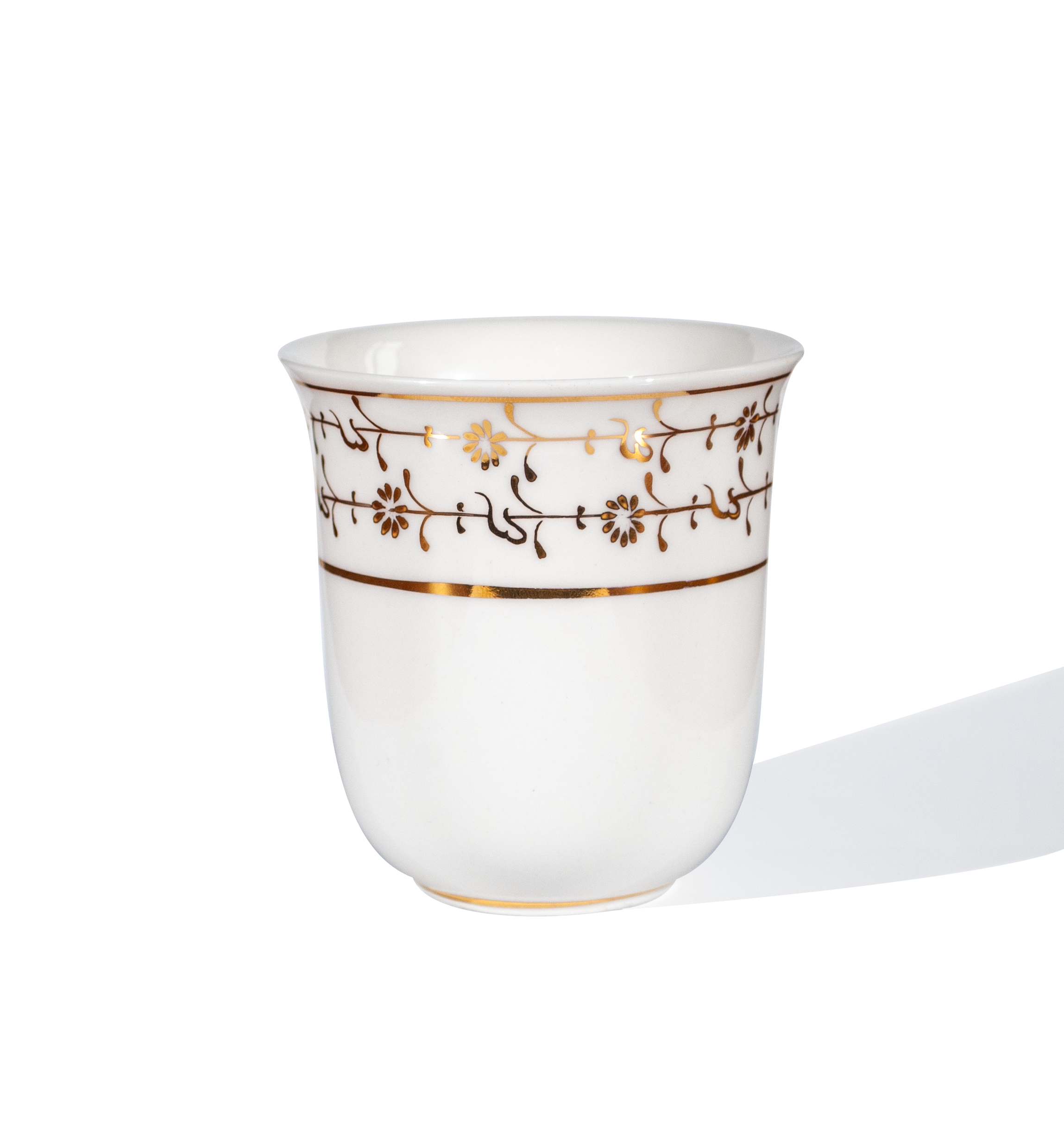 Entirely hand-decorated with real gold, this handleless porcelain cup is inspired by the elegant Halic pattern of 16th-century Iznik ceramics. Measuring 8 cm in height and 7.5 cm in diameter, it holds approximately 170 ml. Each detail is delicately crafted to bring timeless Ottoman artistry into modern table settings — a refined piece for elegant presentations and special occasions.
