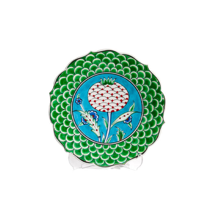 Iznik-Teller ist kunstvoll mit Granatblüten auf türkisfarbenem Grund dekoriert. Die grünen Fischschuppen auf den Relief-Rändern verleihen ihm besondere Tiefe und Detailreichtum.