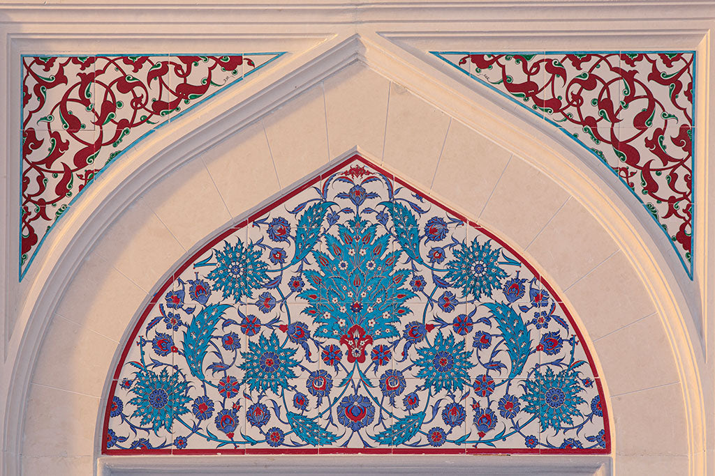 Mit Fliesen verkleidete Moscheefenstergiebel sind ein häufiges Merkmal traditioneller Moscheearchitektur und ein ästhetisch ansprechendes Detail. Solche Giebel sind mit den reichen Mustern und Farben der Fliesenkunst verziert und bilden oft ein zentrales Element des Moscheeninneren.